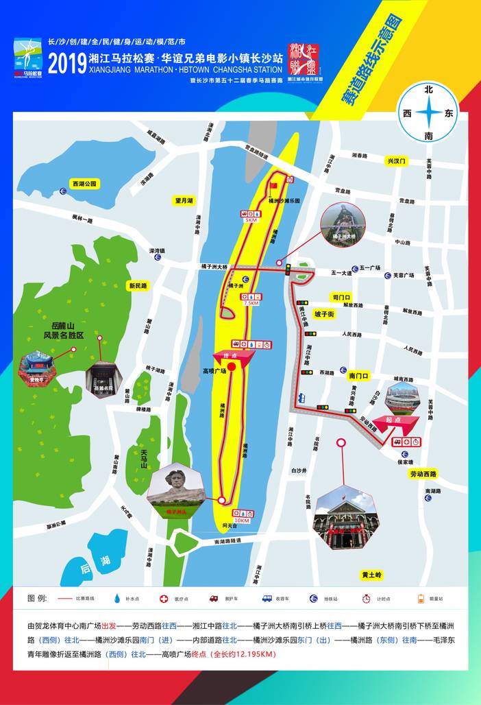 由贺龙体育中心南广场出发——劳动西路往西——湘江中路往北——橘子洲大桥南引桥上桥往西——橘子洲大桥南引桥下桥至橘洲路(西侧)往北——橘洲沙滩乐园南门(进)——内部道路往北——橘洲沙滩乐园东门(出)——橘洲路(东侧)往南——毛泽东青年雕像折返至橘洲路(西侧)往北——高喷广场终点(全长约12.195KM)