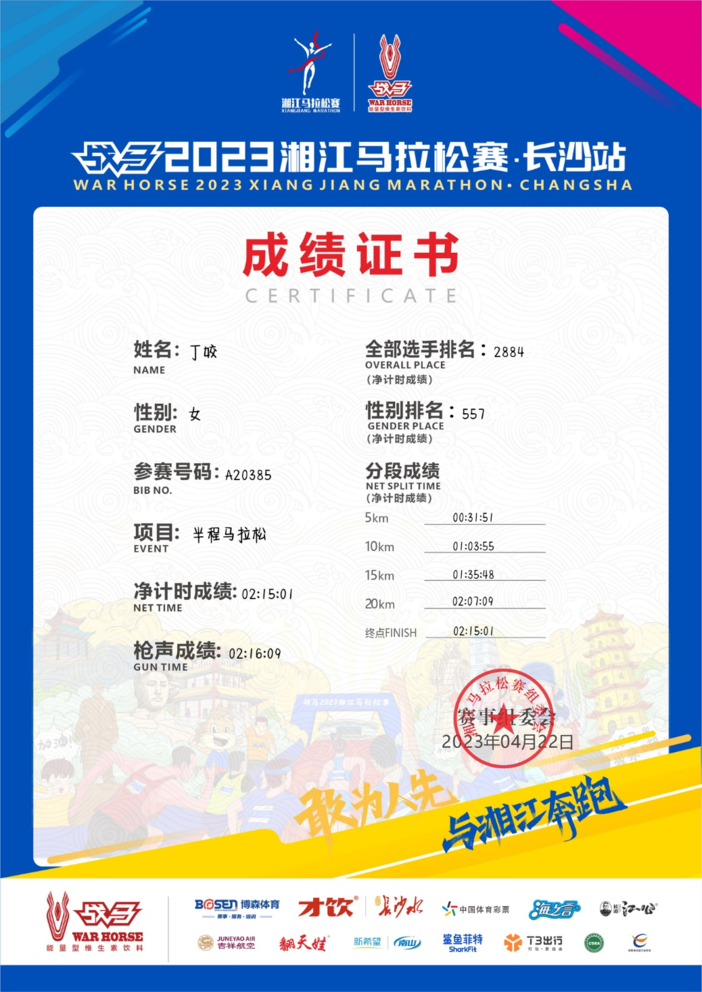 丁姣在战马2023湘江马拉松赛长沙站获得的证书
